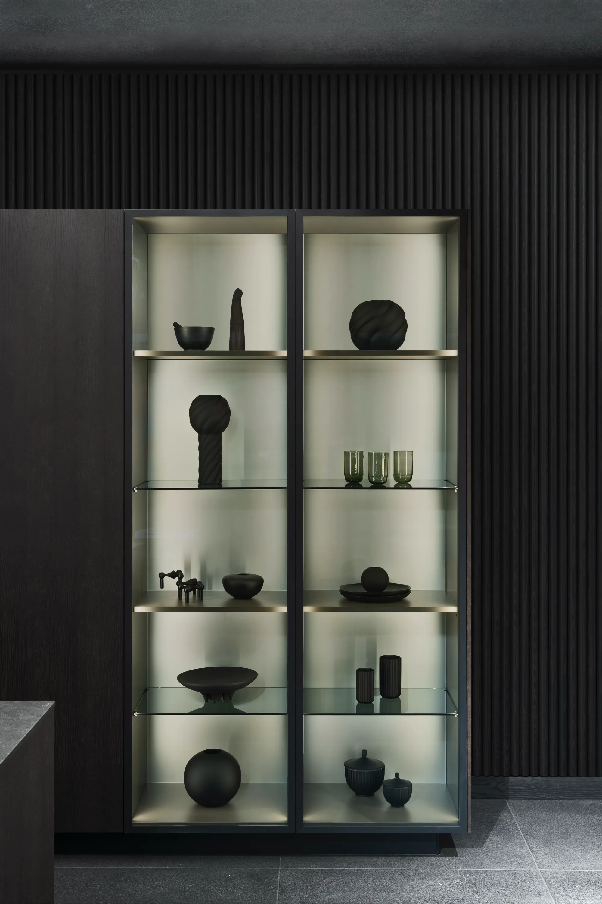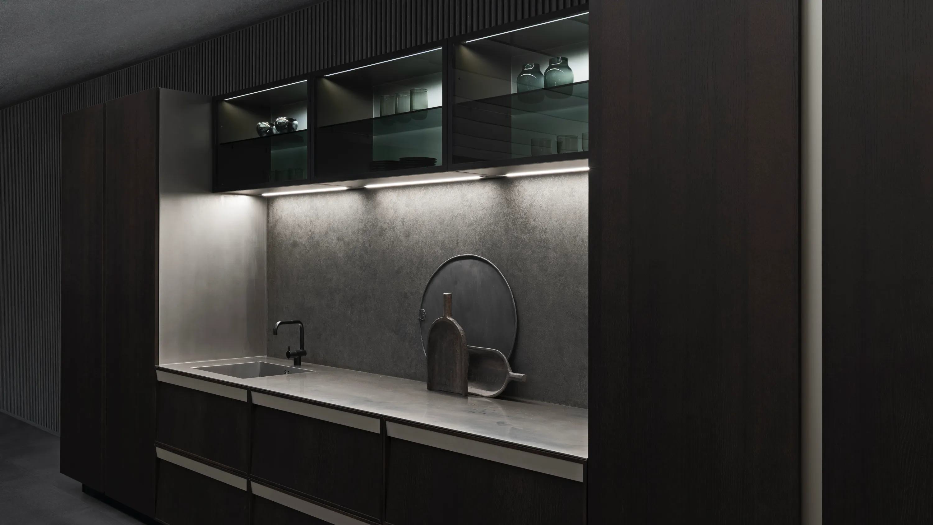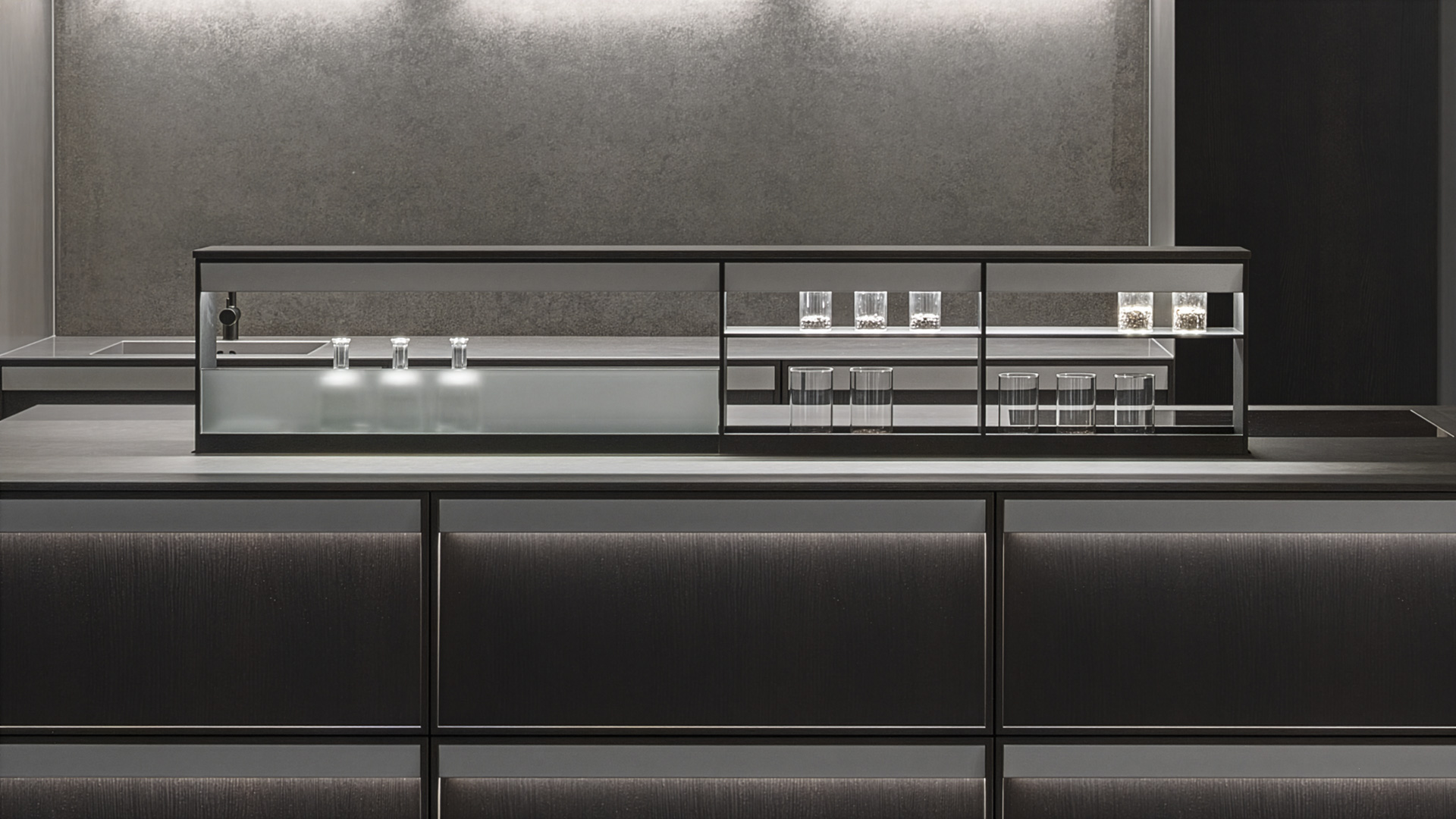 A concealed light source is integrated into the recessed handle. It emits a soft, glare-free glow that gently sweeps across the front. This keeps the design clean and minimal, while subtly highlighting the material and form.